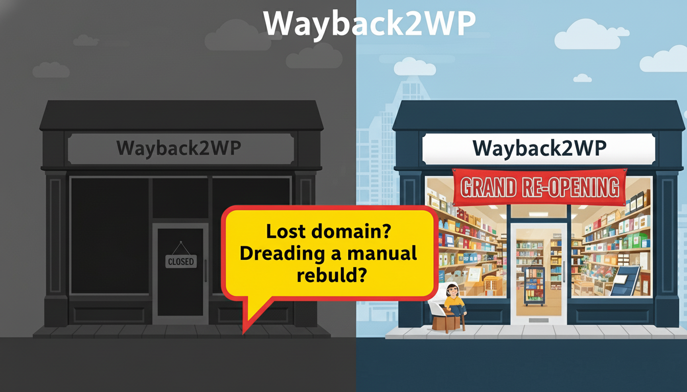 Wayback2WP rebuilds websites from the Internet Archive’s Wayback Machine directly and automatically into a live WordPress website — including full support for WooCommerce product pages.